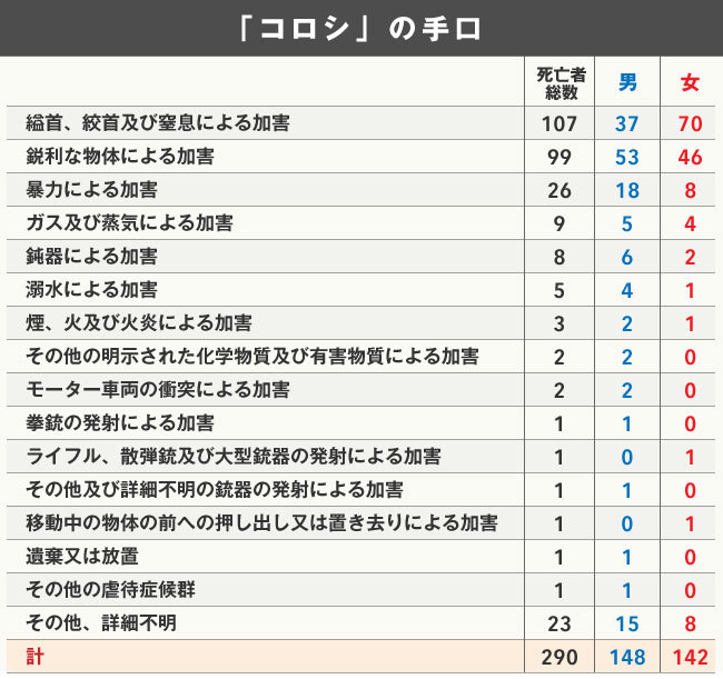 そのレアな手口のひとつが銃器であり、拳銃にライフルなどを含めても3人しかいない(先に触れたように、自殺かコロシか不明とするのが4人いる)。「移動中の物体の前への押し出し又は置き去りによる加害」とは、列車やクルマの接近を狙った突き落としだが、これもレアで1人だけ。「モーター車両の衝突による加害」は、故意にクルマなどを衝突させたケースになるが、これは2人。これらはサスペンスドラマには頻繁に出てきそうな手口だが、実際は滅多にない死に方といえる。