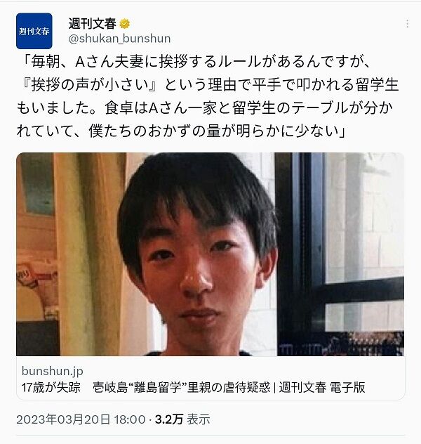 『週刊文春』では、“台風の中、隼都さんを含めた留学生たちを罰として外で正座させた”という証言もあった。