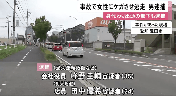 愛知県豊田市で、乗用車でひき逃げして、84歳の女性にけがをさせた上、部下を身代わりで出頭させたなどとして、35歳の自称・飲食店経営の男らが逮捕されました。