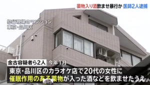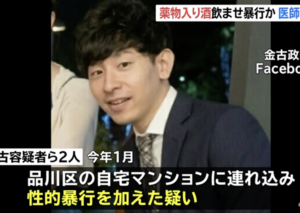 捜査1課によると、逮捕されたのは内科医の金古政隆(28)と、研修医の大林久晃(26)の両容疑者。1月18日深夜~19日早朝、JR目黒駅近くのカラオケ店で20代女性に睡眠作用を引き起こす薬を混ぜた酒を飲ませてもうろうとさせ、タクシーに乗せて金古容疑者の自宅マンションに連れ込み、性的暴行を加えた疑いがある。