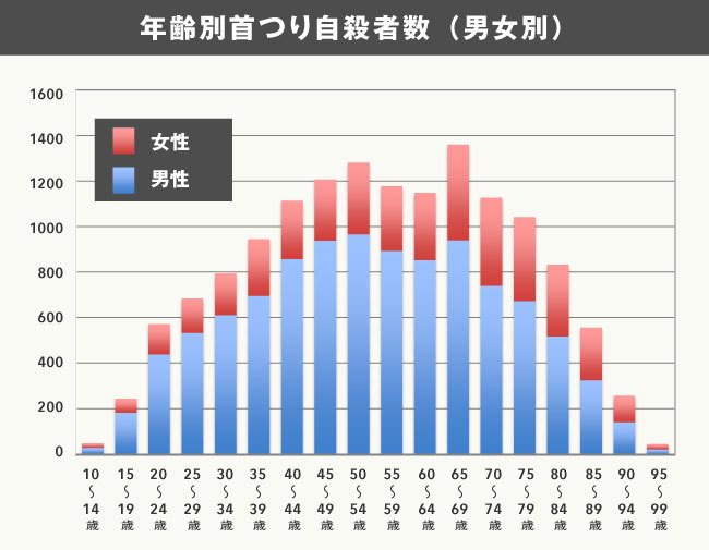 自殺者2万1017人のうち、3分の2にあたる1万4481人が首つり。自殺者の7割が男性で、中心となる年齢層は40~60歳代だ(左図参照)。2位の「高所からの飛び降り」の7倍以上にも達する常套手段である。なお、この首つりの4分の3は自宅で行われている。